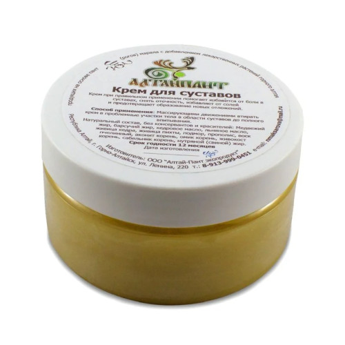 Жир медвежий, жир барсучий, кедровое масло, льняное масло, живица кедра, живица пихты, подмор, прополис, воск пчелиный, аконит корень , омик корень, живокост корень, сабельник корень, нутряной жир, экстракт панта марала. Объем: 200 мл. Срок годности: 12 мес. Применение: Массирующими движениями втирать крем до полного впитывания. Массирующими движениями втирать крем в проблемные участки тела в области суставов до полного впитывания. Свойства: В состав крема входят природные антибиотики, обезболивающие компоненты, которые необходимы при воспалении суставов. Помогает избавиться от боли в суставах, снять отечность, избавляет от солей и предотвращает образование новых отложений.