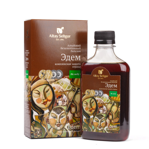 Бальзам серия «Щедрый Алтай» "Эдем" Состав: Сироп (сахар, вода питьевая), колер (сахар, вода питьевая), морс из растительного сырья (вода питьевая, лист земляники, орех кедровый, плоды рябины обыкновенной, плоды боярышника, лист мать-и-мачехи, плоды черемухи обыкновенной, плоды шиповника, трава пустырника обыкновенного, листья мяты перечной обмолоченные, почки березы повислой), сок черноплодной рябины, мед натуральный, регулятор кислотности (лимонная кислота). Описание: Алтайский бальзам на травах рекомендуется для сердечно-сосудистой системы. Безалкогольный бальзам способствует улучшению кровообращения, нормализации сердцебиения. Боярышник, пустырник, лист земляники, мята- активные действующие травы в бальзаме. Травяной сбор в бальзаме способствует улучшению работы сердечной мышцы, предупреждению ее преждевременного переутомления, оказанию успокаивающего действия на организм. При постоянном применении бальзама на травах укрепляется иммунитет, нормализуется кровяное давление, и активизируются защитные силы организма.