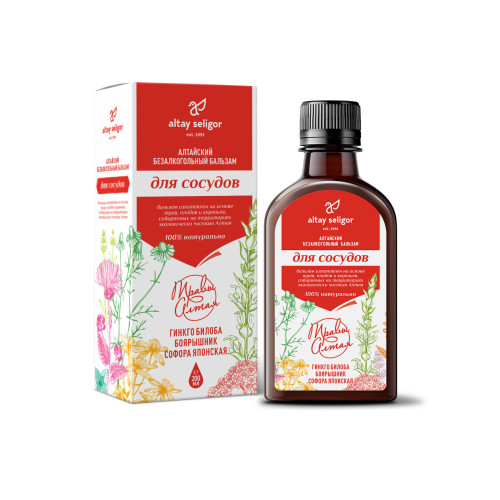 Алтайский безалкогольный бальзам «Для сосудов» Состав: вода питьевая, сахар-песок, плоды шиповника, листья гинкго билоба, трава клевера лугового, плоды софоры японской, плоды боярышника, трава душицы, трава зверобоя, листья мяты, плоды черемухи, регулятор кислотности (лимонная кислота). Рекомендации по применению: употреблять по 1–2 чайных ложки на стакан воды, чая, сока, минеральной воды, молока, другого напитка или в чистом виде 2–3 раза в день во время еды. Продолжительность приема 3–4 недели. При необходимости прием можно продолжить. Противопоказания: индивидуальная непереносимость компонентов, беременность, кормление грудью. Перед применением рекомендуется проконсультироваться с врачом. Условия хранения: хранить при температуре от 0°С до +25°С и относительной влажности воздуха не более 75 %. Избегать воздействия прямых солнечных лучей. После вскрытия упаковки рекомендуется хранить в холодильнике в пределах общего срока хранения. Срок годности: 24 месяца