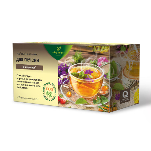 Напиток чайный «Для печени» Состав: кукурузы столбики с рыльцами, трава зверобоя, плоды шиповника, листья мяты перечной, трава горца птичьего (спорыша), цветки бессмертника. Рекомендации по применению: 1 фильтр-пакет залить 1 стаканом кипятка, настаивать 5 минут, периодически надавливая на пакетик. Противопоказания: индивидуальная непереносимость компонентов, беременность, кормление грудью. Перед применением рекомендуется проконсультироваться с врачом. Условия хранения: хранить в помещении при относительной влажности не выше 70%. Срок годности: 24 месяца