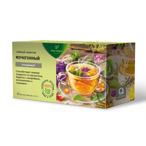 Напиток чайный «Мочегонный» Состав: листья толокнянки, трава клевера лугового, плоды укропа пахучего, листья березы, листья мяты перечной. Рекомендации по применению: 1 фильтр-пакет залить 1 стаканом кипятка, настаивать 5 минут, периодически надавливая на пакетик. Противопоказания: индивидуальная непереносимость компонентов, беременность, кормление грудью. Перед применением рекомендуется проконсультироваться с врачом. Условия хранения: хранить в помещении при относительной влажности не выше 70%. Срок годности: 24 месяца