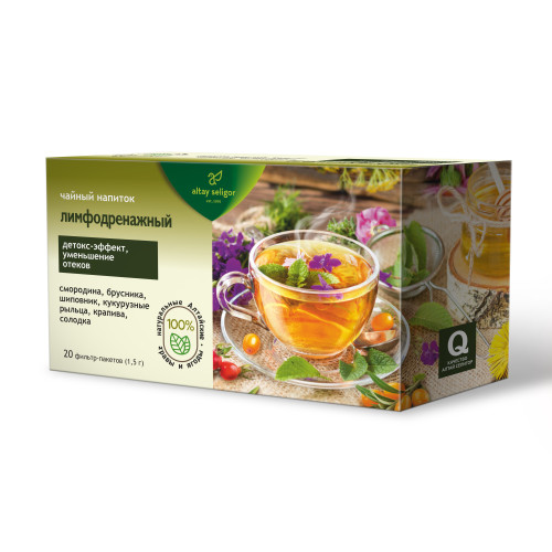 Чайный напиток «Лимфодренажный» Состав: Смородины лист, шиповника плоды, кукурузные рыльца, крапивы двудомной лист, корень солодки. Способ применения: 1 фильтр-пакет залить 1 стаканом кипятка (200 мл), настаивать 7-10 минут, периодически надавливая на пакетик. Принимать взрослым по 1 стакану 2 раза в день во время еды. Противопоказания: индивидуальная непереносимость компонентов. Условия хранения: хранить в помещении при относительной влажности воздуха не выше 70%. Срок годности: 24 месяца.