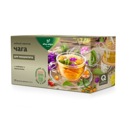 Чай в фильтр пакетах Чага с апельсином Чай из чаги обладает широким спектром целебных свойств. Чага обладает противомикробными и противосептическими свойствами, поэтому активно используется для укрепления иммунитета. Плодовое тело чаги имеет в своем составе щавелевую, муравьиную, уксусную кислоты, полисахариды, клетчатку, смолы, которые улучшают аппетит, устраняют боли. Чага способствует улучшению дыхания, глотания, избавляет от осиплости голоса, снимает воспаление. По вкусу чай из чаги весьма нейтральный, с достаточно тонким древесным запахом, чтобы сделать процесс чаепития более приятным мы добавили для вас апельсин и имбирь. Они ни только дополняют вкус чая, а также усиливают полезные свойства, насыщая витамином С. Рекомендации по применению: 1 фильтр-пакет залить 1 стаканом кипятка (200мл), настаивать 10 – 15 минут, периодически надавливая на пакетик. Продолжительность приема - 1 месяц, при необходимости через 10 дней прием можно повторить. При желании добавить сахар или мёд.