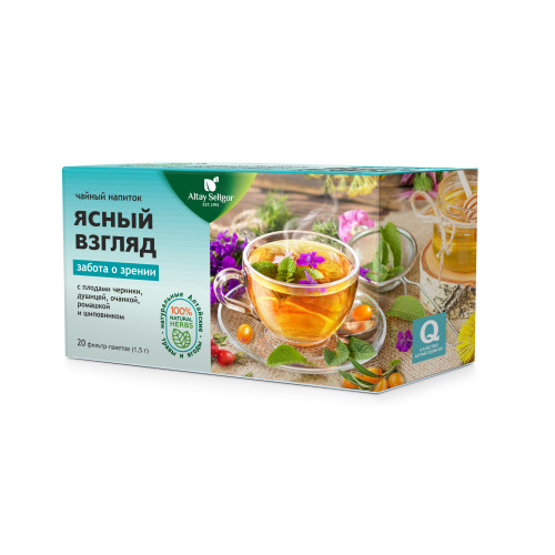 Напиток чайный «Ясный взгляд» Состав: Плоды черники, душица, очанка, ромашка, шиповник. Рекомендации по применению: 1 фильтр-пакет залить 1 стаканом кипятка, настаивать 5 минут, периодически надавливая на пакетик. Противопоказания: индивидуальная непереносимость компонентов, беременность, кормление грудью. Перед применением рекомендуется проконсультироваться с врачом. Условия хранения: хранить в помещении при относительной влажности не выше 70%. Срок годности: 24 месяца