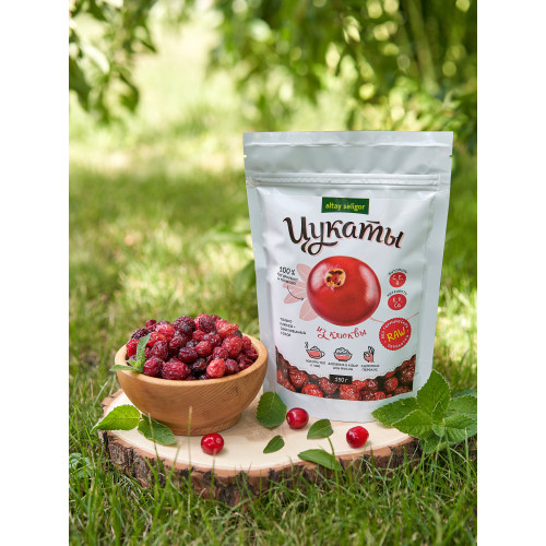 Цукаты из клюквы Состав: клюква, сахар Описание: Яркий вкус сладко-спелой клюквенной кислинки согреет настроение и придаст бодрость. Кроме вкусового удовольствия Вы получите замечательные лечебно-профилактические свойства и целый витаминный комплекс. В нее входят натуральные кислоты: лимонная, яблочная, олеиновая, бензойная. Обогащена ягода пектинами, бетаином, катехином, холином, глюкозой, фруктозой, сахарозой, клетчаткой. Входящие в состав ягод витамины А, С, К, витамины группы В, органические кислоты способствует работе мозга, улучшает метаболизм. Содержащиеся в составе ягод витамины С, РР, благотворно влияют на состояние сосудов. Они выводят холестерин из крови. Употребление клюквы является профилактикой варикоза, тромбоза, укрепляет сосуды, улучшает кровообращение. Все это поддерживает работу сердца. Отлично выводит шлаки, токсины это важно при воспалительных процессах. Являясь сильным антиоксидантом, клюква, в состав которой входит витамин Е, не позволяет свободным радикалам негативно влиять на клеточный обмен, что приводит к омолаживающему эффекту. Йод, магний, калий, входящие в состав плодов, нормализуют сон, нейтрализуют беспокойство, стрессовое состояние. Регулярное употребление клюквы стимулирует деятельность органов пищеварения. Полезна клюква для профилактики заболеваний почек, мочевыводящих путей, при воспалении этих органов.