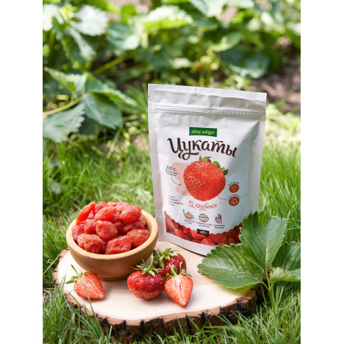 Цукаты Клубника Состав: клубника, сахар. Пищевая ценность в 100 гр продукта: белки -1,5г., жиры-0,2г., углеводы-73,0г. Энергетическая ценность (калорийность) в 100гр.продукта: 1290кДж/310 ккал. Масса нетто: 150 гр. Срок годности: 12 месяцев. Условия хранения: хранить при температуре от +2 °С до +25°С и относительной влажности воздуха не более 75%.