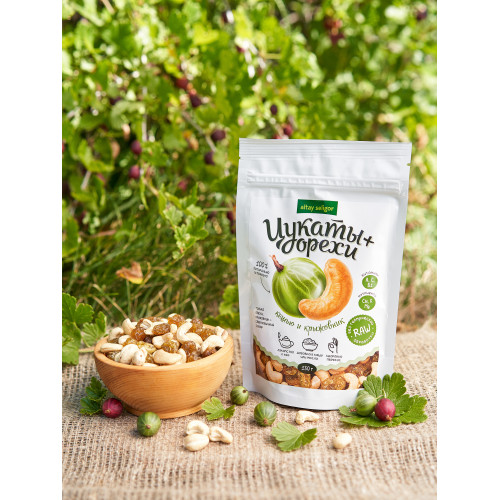 Смесь орехово-ягодная: Кешью Крыжовник Состав: ядро кешью, цукат крыжовника (ягода крыжовника, сахар белый). Пищевая ценность в 100 гр продукта: белки -20,0г., жиры-24,0г., углеводы-54,0г. Энергетическая ценность (калорийность) в 100 гр.продукта: 2050 кДж/490 ккал. Масса нетто: 150 гр. Срок годности: 12 месяцев. Условия хранения: хранить при температуре до +25°С и относительной влажности воздуха не более 75%.