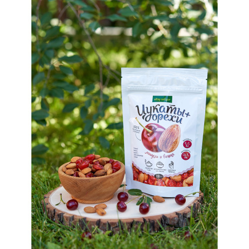 Смесь орехово-ягодная: Миндаль Вишня Состав: ядро миндаля сладкого, цукат вишни (ягода вишни, сахар белый). Пищевая ценность в 100 гр продукта: белки -21,0г., жиры-27,0г., углеводы-38,0г. Энергетическая ценность (калорийность) в 100 гр.продукта: 1890кДж/450 ккал. Масса нетто: 150 гр. Срок годности: 12 месяцев. Условия хранения: хранить при температуре от +2°С до +25°С и относительной влажности воздуха не более 75%.