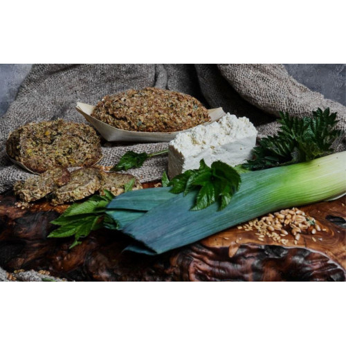 Состав (без муки): пророщенная пшеница; семена льна; тофу; крапива; сныть; лук-порей; лук-шалот; лавровый лист; зира; укроп; перец чёрный; перец красный; куркума; имбирь; кокосовое нерафинированное масло; соль гималайская; хмеле-медовая закваска.