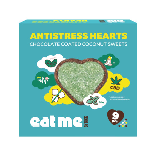 Стружка кокосовая, патока крахмальная, сахар тростниковый нерафинированный, сироп топинамбура, какао-масло, масло ши рафинированное, ядра ореха кешью, какао тертое, какао-порошок алкализованный, масло кокосовое, масло CBD (масло ядра семян конопли 80%, изолят каннабидиола-20%), эмульгатор лецитин подсолнечный, эфирное масло мяты, магния цитрат, ароматизатор натуральный ваниль, краситель натуральный медные комплексы хлорофиллов