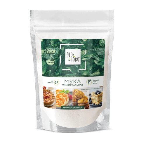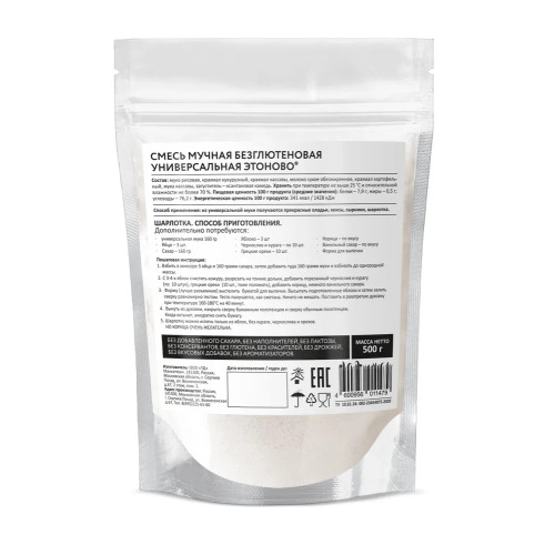 Состав: мука рисовая, крахмал кукурузный, крахмал кассавы, молоко сухое обезжиренное, крахмал картофельный, мука кассавы, загуститель – ксантановая камедь. Пищевая ценность 100 г продукта (средние значения): белки – 7,9 г; жиры – 0,5 г; углеводы – 76,2 г. Энергетическая ценность 100 г продукта: 341 ккал / 1428 кДж