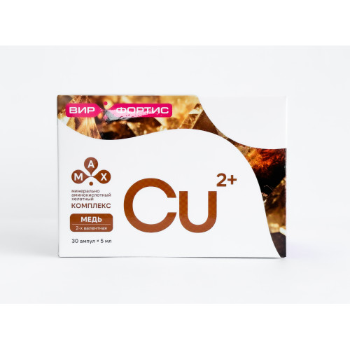 Концентрат напитка «MAX Комплекс» с медью поддерживает кроветворение и усвоение железа, способствуя профилактике анемии. Он укрепляет иммунитет, поддерживает работу нервной системы и мозга. Медь участвует в антиоксидантной защите, синтезе коллагена и обмене веществ, замедляя процессы старения. Уникальные свойства минерального аминокислотного хелатного комплекса с медью: 1.Участвует в кроветворении и усвоении железа 2.Улучшает функционирование иммунной системы 3.Способствует синтезу коллагена и эластина (здоровье кожи, костей, сосудов) 4.Помогает в антиоксидантной защите (замедляет старение, снижает риск болезней сердца, диабета) 5.Участвует в обмене липидов, белков и углеводов 6.Поддерживает работу нервной системы и мозга 7.Является профилактикой анемии, поддерживает нормальный обмена железа 8.Участвует в окислительно-восстановительных реакциях Состав: водный экстракт пихты сибирской (полифенолы, флавоноиды, витамины А, В2, С, Е, минералы Mg, Zn), бисглицинат меди (Cu(II)) Форма выпуска: 30 ампул по 5 мл Способ применения: во время еды, во второй половине дня, допускается разведение в соках или воде Продолжительность приема: 1 месяц, при необходимости прием можно повторить Противопоказания: индивидуальная непереносимость компонентов Условия хранения: при комнатной температуре, в сухом и защищенном от света месте, не доступном для детей Срок годности: 2 года с даты изготовления, указанной на упаковке Производство: Россия