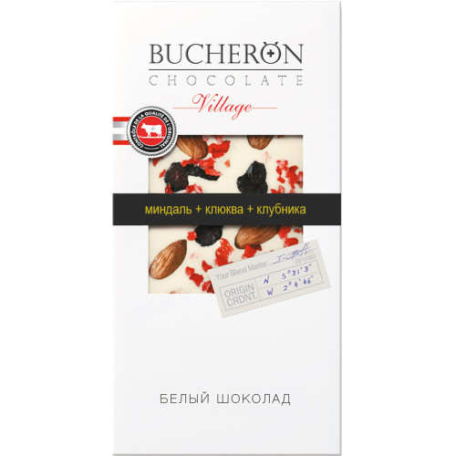 Состав: Сахар, масло какао, молоко сухое цельное, ядро ореха миндаля жареное, клюква сушеная (клюква, сахар, подсолнечное масло), кусочки клубники сушеной (глюкозный сироп, клубника, сахар, картофельный крахмал), эмульгатор (лецитин соевый), экстракт ванили. Может содержать следы других видов орехов и арахиса. Массовые доли в белом шоколаде: масла какао — не менее 33,0%, сухого общего остатка молока — не менее 18,0%, молочного жира — не менее 4,5%. Общее содержание какао-продуктов в белом шоколаде — не менее 33,0%. Пищевая и энергетическая ценностьПищевая ценность 100 г продукта* : белки — 7,0 г. жиры** — 39,0 г. углеводы — 49,0 г. Энергетическая ценность 100 г продукта: 2400 кДж/580 ккал.