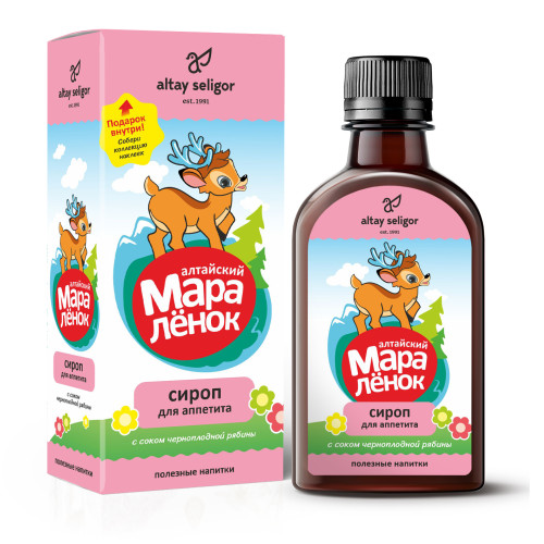 Состав: вода питьевая, сахар-песок, сок черноплодной рябины, загуститель (пектин), трава мелиссы лекарственной, плоды тмина обыкновенного, плоды фенхеля обыкновенного, лист черной смородины, трава душицы, цветки ромашки, плоды шиповника, регулятор кислотности (лимонная кислота). Описание: Внутри коробки вашего малыша ждет сюрприз – наклейка «Путешествия маралёнка»! Изучайте и угадывайте страны, в которых побывал Алтайский маралёнок вместе с нами!!! Натуральные растительные компоненты, входящие в состав травяного сиропа, способствуют улучшению аппетита и обмена веществ. Не содержит красителей и ароматизаторов, благоприятно воздействует на пищеварительную систему организма. Ягоды черноплодной рябины содержат богатый природный комплекс витаминов (P, C, E, K, B1, B2, B6, бета-каротин), макро- и микроэлементов (бор, железо, марганец, медь, молибден, фтор), сахаров (глюкоза, сахароза, фруктоза), пектиновых и дубильных веществ. Тмин имеет свойство, повышающее секретную и моторную функции желудка и способствует возбуждению аппетита.