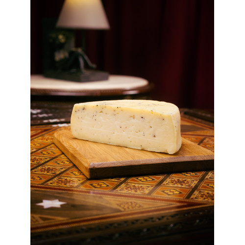 Благодаря использованию как экстракта, так и стружки настоящего трюфеля, сыр приобретает насыщенный землисто-грибной аромат и глубокий благородный вкус. Текстура сыра — нежная и эластичная, с вкраплениями трюфельной стружки, создающими изысканный визуальный и вкусовой акцент. Особенности: • Умеренная жирность 45% • Нежная, эластичная консистенция • Кремовый цвет с тёмными вкраплениями трюфеля • Насыщенный аромат лесного трюфеля • Сливочно-грибной вкус с долгим послевкусием • Натуральные компоненты без искусственных добавок Сочетаемость: Напитки: • Красное вино (барбареско, бароло) • Белое вино (шардоне выдержанное) • Креплёные вина (херес, мадера) • Тёмный эль • Коньяк Закуски и бутерброды: • Элитные сырные тарелки с мёдом • Канапе с грушей и грецкими орехами • Бутерброды с чёрным хлебом и оливковым маслом • Тарталетки с пармской ветчиной Горячие блюда: • Ризотто с грибами • Паста с трюфельным соусом • Карпаччо с сыром • Запечённые овощи с сырным соусом Идеальные дополнения: Фрукты и ягоды: • Груша • Инжир • Виноград • Ягоды (малина, чёрная смородина) Орехи и семена: • Грецкие орехи • Фундук • Миндаль • Кедровые орехи Мясо и морепродукты: • Говяжий стейк • Утиная грудка • Морепродукты в сливочном соусе • Прошутто Популярные блюда с сыром: Выпечка: • Трюфельные сырные пироги • Круассаны с трюфельной начинкой • Булочки с сыром и зеленью • Пицца с трюфелем и пармской ветчиной Соусы и закуски: • Трюфельный сырный соус • Сырные палочки с трюфельным маслом • Крем-супы с трюфелем • Закуски с хрустящими гренками Особые рекомендации: • Подавать при комнатной температуре для полного раскрытия аромата • Идеально сочетается с молодым картофелем и трюфельным маслом • Подходит для приготовления изысканных соусов • Отлично плавится, сохраняя аромат трюфеля • Рекомендуется для особых случаев и гастрономических ужинов