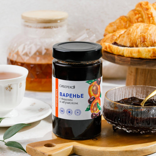 Состав: Сахар, вишня (без косточки) быстрозамороженная, абрикосы быстрозамороженные, лимонная кислота (регулятор кислотности). Возможно наличие следов орехов, молочных продуктов, злаков, содержащих глютен. Продукт может содержать кусочки фруктовых (ягодных) косточек.