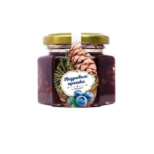 Ядро кедрового ореха, сахар, отвар из черники, ягоды черники, натуральный лимонный сок.Пищевая ценность в 100 г продукта: Белки - 2, 6 г, жиры - 12, 8 г, Углеводы – 60 г.Энергетическая ценность в 100 г продукта: 365, 8 Ккал/ 1531 Кдж
