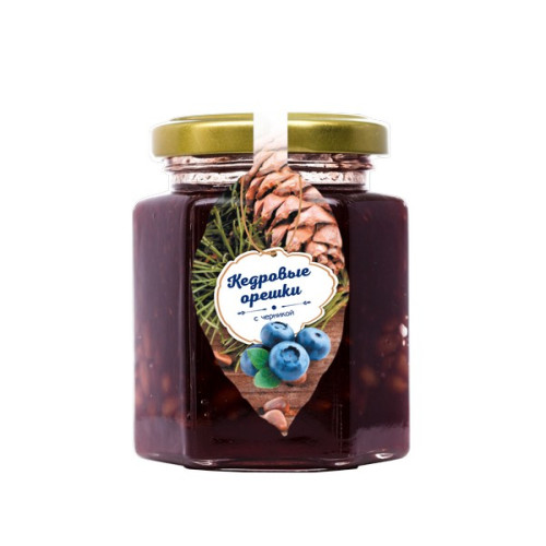 Ядро кедрового ореха, сахар, отвар из черники, ягоды черники, натуральный лимонный сок.Пищевая ценность в 100 г продукта: Белки - 2, 6 г, жиры - 12, 8 г, Углеводы – 60 г. Энергетическая ценность в 100 г продукта: 365, 8 Ккал/ 1531 Кдж