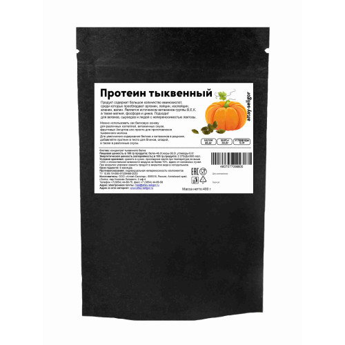 Протеин тыквенный Состав: концентрат тыквенного белка Пищевая ценность в 100 гр продукта: белки -46,0г., жиры-38,0г., углеводы-5,0г. Энергетическая ценность (калорийность) в 100гр. продукта: 2270кДж/550 ккал. Условия хранения: хранить в сухом, прохладном месте при температуре не выше +20°С и относительной влажности воздуха не более 70%, вдали от солнечных лучей. При вскрытии упаковки хранить продукт в закрытом виде в холодильнике. Противопоказания: индивидуальная непереносимость компонентов Срок годности: 6 месяцев. Масса нетто:400 гр