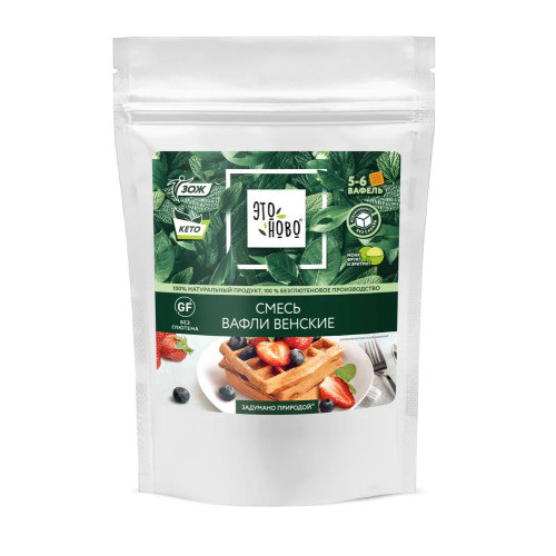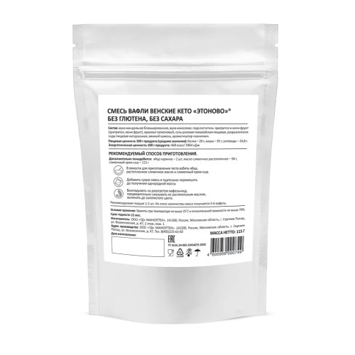 Состав: мука миндальная бланшированная, мука кокосовая, подсластитель: эритритол и монк фрукт (эритритол, монк фрукт), крахмал тапиоковый, соль гималайская розовая молотая, разрыхлители: сода пищевая натуральная, винный камень, ароматизатор натуральный ванилин Пищевая ценность 100 г продукта (средние значения): белки –20 г, жиры – 35 г, углеводы – 24,8 г Энергетическая ценность (калорийность): 469 ккал/ 1964 кДж