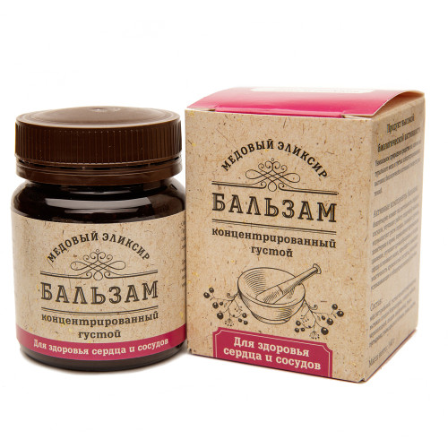 Уникальное природное средство благотворно влияет на деятельность сердца и сосудов, улучшает работу сердечной мышцы, нормализует ритм сердца, снижает уровень холестерина в крови, нормализует артериальное давление, улучшает кровообращение в сосудах сердца и головного мозга, укрепляет и повышает эластичность кровеносных сосудов, оказывает успокаивающее и общеукрепляющее действие. Состав: Мёд натуральный, густые концентрированные вытяжки плодов боярышника, плодов рябины черноплодной, плодов шиповника, травы пустырника, травы красного клевера, травы кипрея. Воздействие на организм обусловлено входящими в его состав компонентами: Боярышник улучшает работу и повышает тонус сердечной мышцы, регулирует сердцебиение, улучшает кровообращение в сосудах сердца и головного мозга, снимает спазмы сосудов, способствует снижению артериального давления. Пустырник обладает успокаивающим действием, снимает раздражительность и повышенную нервную возбудимость, обладает противосудорожным действием. Нормализует нарушения сердечного ритма, замедляет ритм и увеличивает силу сердечных сокращений. Положительно влияет на течение климактерического периода у женщин. Красный клевер нормализует липидный обмен, снижает содержание холестерина в крови, обладает антиокислительными свойствами. Эффективен в профилактике атеросклероза и стенокардии. Повышает эластичность и снижает проницаемость кровеносных сосудов и капилляров. Снижает головные боли и головокружения. Кипрей обладает мягким успокаивающим действием, способствует повышению иммунитета, оказывает антиоксидантное действие, благоприятно действует на сердечно-сосудистую систему. Рябина черноплодная является богатейшим источником витаминов и микроэлементов, положительно влияет на работу эндокринной системы, способствует очищению организма от шлаков и токсинов. Шиповник является источником витамина С, улучшает кровоснабжение тканей, стимулирует процессы регенерации, обладает противосклеротическим действием, повышает умственную и физическую работоспособность. Мёд положительно влияет на функции сердца и сосудов, улучшает обменные процессы в сердечной мышце, улучшает сон, повышает настроение и жизненный тонус.