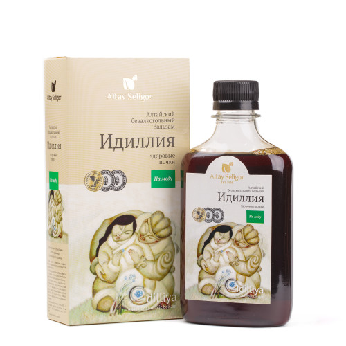 Бальзам серия «Щедрый Алтай» "Идиллия" Состав: Сироп (сахар, вода питьевая), колер (сахар, вода питьевая), морс из растительного сырья (вода питьевая, плоды шиповника, плоды рябины обыкновенной, плоды черемухи обыкновенной, трава зверобоя, трава чабреца обмолоченная), сок черноплодной рябины, мед натуральный, регулятор кислотности (лимонная кислота). Описание: Алтайский бальзам на травах рекомендуется при отеках и воспалений в почках. Безалкогольный бальзам оказывает противовоспалительное и мочегонное действия в организме. Рябина обыкновенная, шиповник, зверобой, чабрец и мед - активные действующие компоненты в бальзаме. Травяной сбор в бальзаме оказывает мягкое воздействие на организм, способствует снятию воспалений, уменьшению болевых ощущений в почках. При постоянном применении бальзама укрепляется иммунитет, улучшается работа почек.