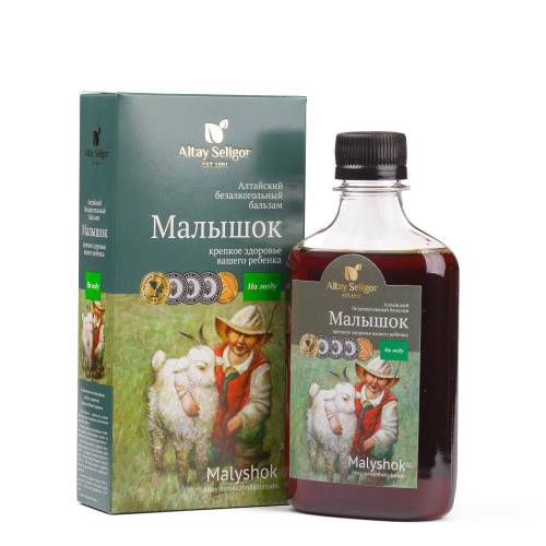 Бальзам серия «Щедрый Алтай» "Малышок" Состав: Сироп (сахар, вода питьевая), колер (сахар, вода питьевая), морс из растительного сырья (вода питьевая, поды шиповника, плоды рябины обыкновенной, трава душицы, трава зверобоя, плоды черемухи обыкновенной, листья мяты перечной обмолоченные, корни и корневища солодки), сок черноплодной рябины, мед натуральный, регулятор кислотности (лимонная кислота). Описание: Алтайский бальзам на травах рекомендуется детям в качестве общеукрепляющего средства. Безалкогольный бальзам оказывает мягкое оздоровительное воздействие на весь организм, способствует повышению сопротивляемости детского организма инфекционным и простудным заболеваниям. Мята перечная, шиповник, солодка - активные действующие травы в бальзаме. Травяной сбор в бальзаме является богатым источником витаминов и укрепляет иммунитет ребенка. При постоянном применении бальзама повышается сопротивляемость организма к простудным заболеваниям и усиливается аппетит.