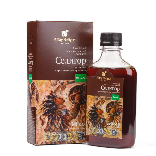 Бальзам серия «Щедрый Алтай» "Селигор" Состав: Сироп (сахар, вода питьевая), колер (сахар, вода питьевая), морс из растительного сырья (вода питьевая, плоды аронии черноплодной, плоды черемухи обыкновенной, плоды шиповника, корневища с корнями родиолы розовой, орех кедровый, листья малины обыкновенной, трава душицы, корневища аира, корни и корневища девясила, лист мать-и-мачехи, плоды рябины обыкновенной, почки березы повислой), сок черноплодной рябины, мед натуральный, регулятор кислотности (лимонная кислота). Описание: Алтайский бальзам на травах рекомендуется при пониженном иммунитете. Безалкогольный бальзам способствует укреплению иммунной системы и оказывает антиоксидантное действие. Орех кедровый, родиола, шиповник, лист малины - активные действующие травы в бальзаме. Травяной сбор в бальзаме способствует восстановлению сил организма, повышает работоспособность и сопротивляемость при острых простудных заболеваниях. При постоянном применении бальзама на травах укрепляется иммунитет, улучшается в целом состояние организма.