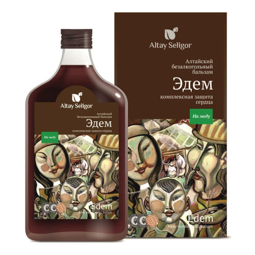 Бальзам серия «Щедрый Алтай» "Эдем" Состав: Сироп (сахар, вода питьевая), колер (сахар, вода питьевая), морс из растительного сырья (вода питьевая, лист земляники, орех кедровый, плоды рябины обыкновенной, плоды боярышника, лист мать-и-мачехи, плоды черемухи обыкновенной, плоды шиповника, трава пустырника обыкновенного, листья мяты перечной обмолоченные, почки березы повислой), сок черноплодной рябины, мед натуральный, регулятор кислотности (лимонная кислота). Описание: Алтайский бальзам на травах рекомендуется для сердечно-сосудистой системы. Безалкогольный бальзам способствует улучшению кровообращения, нормализации сердцебиения. Боярышник, пустырник, лист земляники, мята- активные действующие травы в бальзаме. Травяной сбор в бальзаме способствует улучшению работы сердечной мышцы, предупреждению ее преждевременного переутомления, оказанию успокаивающего действия на организм. При постоянном применении бальзама на травах укрепляется иммунитет, нормализуется кровяное давление, и активизируются защитные силы организма.