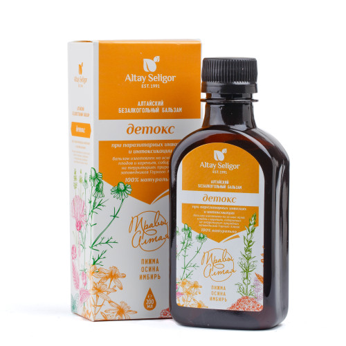 Бальзам "Детокс" Состав: вода питьевая, сахар-песок, кора осины, цветки пижмы, почки гвоздики, цветки бессмертника, корни одуванчика, корни имбиря, плоды шиповника, регулятор кислотности (лимонная кислота). Описание: Алтайский бальзам на травах рекомендуется при паразитарных заражениях организма в комплексной терапии. Безалкогольный бальзам способствует выведению токсичных веществ жизнедеятельности паразитов и повышает иммунитет организма. Активные действующие компоненты Пижма, осина и имбирь - активные действующие компоненты в бальзаме. Травяной сбор в бальзаме оказывает мягкое воздействие на организм, помогая справиться с паразитами в комплексной терапии. При постоянном применении бальзама повышаются защитные силы.