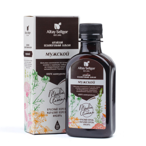 Бальзам "Мужской" Состав: Сахар-песок, вода питьевая, копеечник чайный (красный корень), трава зверобоя, корни и корневища левзеи (маралий корень), корни и корневища родиолы розовой (золотой корень), корни имбиря, трава клевера, плоды кориандра, листья крапивы, трава чабреца, регулятор кислотности (лимонная кислота). Описание: Алтайский бальзам на травах рекомендуется для мужчин при повышенных физических нагрузках и стрессе. Безалкогольный бальзам оказывает мягкое тонизирующее и общеукрепляющее воздействие на весь мужской организм. Активные действующие компоненты Копеечник чайный (красный корень), левзея (маралий корень), имбирь - активные действующие компоненты в бальзаме. Травяной сбор в бальзаме способствует выработке мужского полового гормона и увеличению потенции.