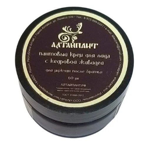 Пантовое масло, родниковая вода, кедровая живица, настойка (маралий корень, золотой корень), Д-пантенол, витамин Е, ментол, кунжутное масло, эмульсионный воск, бензоат натрия, сорбат калия. Объем 60 мл. Применение: Нанести на кожу лица и шеи сразу после бритья. Рекомендуется использовать сразу после бритья и в качестве дополнительного ухода за кожей. Свойства: Крем на основе пантового масла обладает омолаживающим, регенерирующим, увлажняющим эффектом. Кедровая живица снимает раздражение, предупреждает воспаление, смягчат и увлажняет кожу лица и шеи, придает упругость и эластичность. Сочетание золотого корня и маральего корня тонизирует, обогащает витаминами, защищает от негативного воздействия окружающей среды. Ментол освежает и успокаивает. Срок годности: 6 месяцев.
