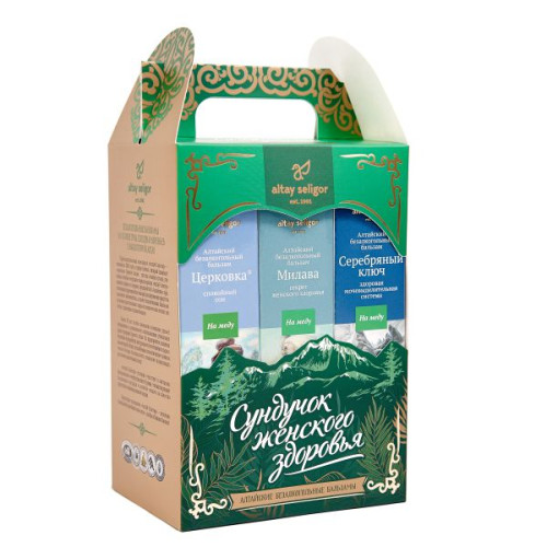 Сундучок Женского здоровья Состав: Бальзам «Милава», Бальзам «Церковка», Бальзам «Серебряный ключ» Пищевая ценность в 100 гр продукта: углеводы - 62,0г. Энергетическая ценность (калорийность) в 100 гр.продукта: 250 ккал., 1050 кДж Масса нетто: 990 гр. Срок годности: 24 месяцев. Условия хранения: хранить при температуре до +25°С и относительной влажности Что подарить маме, подруге или коллеге по работе? Хорошим подарком с заботой о здоровье станет подарочный «Сундучок Женского здоровья» от Алтай-Селигор. В состав подарочного набора входят 3 бальзама. Каждый продукт в сундучке подобран с учётом потребностей женского организма: Бальзам на меду "Милава" 250 мл, Бальзам на меду "Церковка" 250 мл, Бальзам на меду "Серебряный ключ" 250 мл Алтайский бальзам «Милава» рекомендуется принимать при женских заболеваниях воспалительного характера, способствует регенерации тканей, оказывает тонизирующие и омолаживающее действие на женский организм. Алтайский бальзам «Церковка» рекомендуется при расстройстве центральной нервной системы. Безалкогольный бальзам способствует снятию нервного напряжения, сокращению времени засыпания, улучшению продолжительности и глубины сна. Алтайский бальзам «Серебряный ключ» рекомендуется при воспалении почек и мочевыделительной системы. Безалкогольный бальзам способствует выведению излишков жидкости из организма, оказывает бактерицидный и противовоспалительный эффект.
