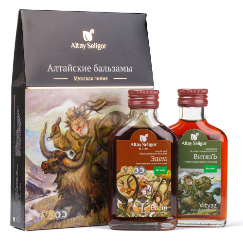 Подарочный набор "Мужской" Описание: Безалкогольный бальзам на меду "Эдем" Состав: Сироп (сахар, вода питьевая), колер (сахар, вода питьевая), морс из растительного сырья (вода питьевая, лист земляники, орех кедровый, плоды рябины обыкновенной, плоды боярышника, лист мать-и-мачехи, плоды черемухи обыкновенной, плоды шиповника, трава пустырника обыкновенного, листья мяты перечной обмолоченные, почки березы повислой), сок черноплодной рябины, мед натуральный, регулятор кислотности (лимонная кислота). Объем: 100 мл. Безалкогольный бальзам на меду «ВитязЪ» Состав: Сироп (сахар, вода питьевая), колер (сахар, вода питьевая), морс из растительного сырья (вода питьевая, корни и корневища копеечника чайного (красного корня), плоды рябины обыкновенной, корневища аира, корни и корневища родиолы розовой, лист бадана толстолистного, корни и корневища девясила, орех кедровый, имбирь), сок черноплодной рябины, мед, регулятор кислотности (лимонная кислота). Объем: 100 мл. Не является лекарством.