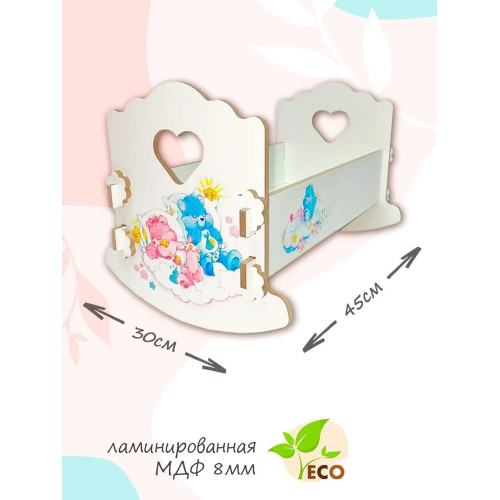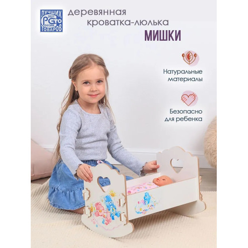 Кроватка-люлька белого цвета с УФ-печатью «Мишка» со спальным местом размером 41*20 см, постельных инадлежностей в комплекте нет. Изделие выполнено из натуральных материалов, прошло строгую международную сертификацию, абсолютно безопасно для детей. Детали крепятся по типу конструктора на шип-паз и саморезы, в комплекте есть печатная и видеоинструкция - собрать легко, справится даже мама.